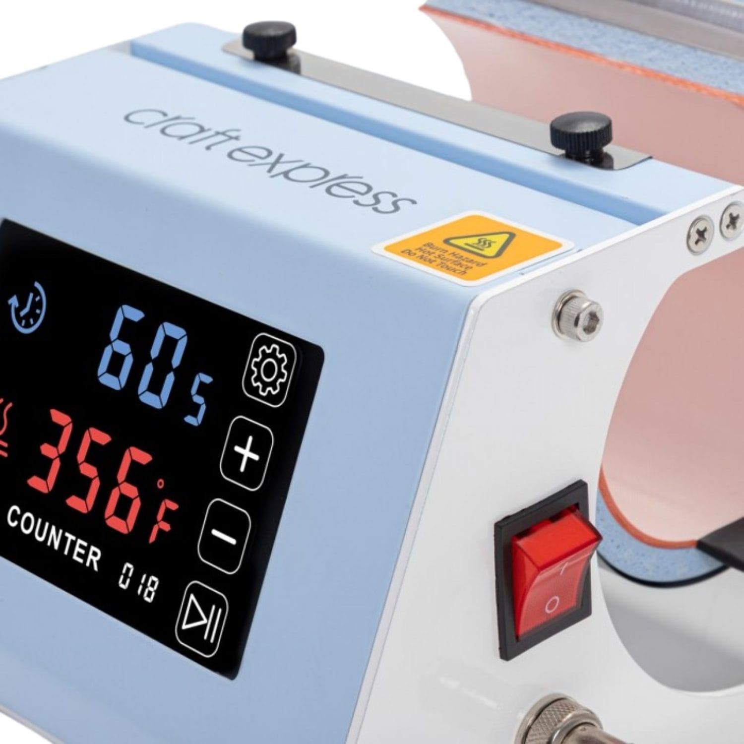 Su formato compacto facilita instalarla en mesón y trabajar con flujo continuo, mientras que el control de temperatura (0 a 250°C) y el temporizador (0 a 999 segundos) permiten repetir parámetros y reducir mermas cuando produces por pedido. Con una correcta configuración de tiempo, temperatura y presión, ayuda a lograr transferencias más uniformes, con mejor definición y asentamiento del color, especialmente en diseños con áreas amplias.
