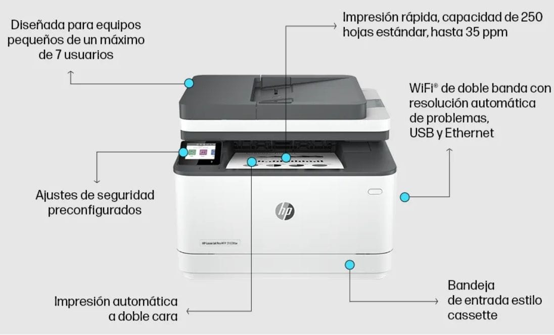 La HP LaserJet Pro MFP 3103FDW es una impresora multifuncional diseñada para pequeñas y medianas oficinas que buscan eficiencia, velocidad y confiabilidad en un solo dispositivo. Además, combina las funciones de impresión, escaneo, copiado y fax, lo que permite centralizar todas las tareas de oficina en un equipo compacto y fácil de usar.