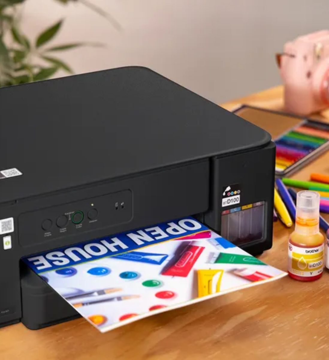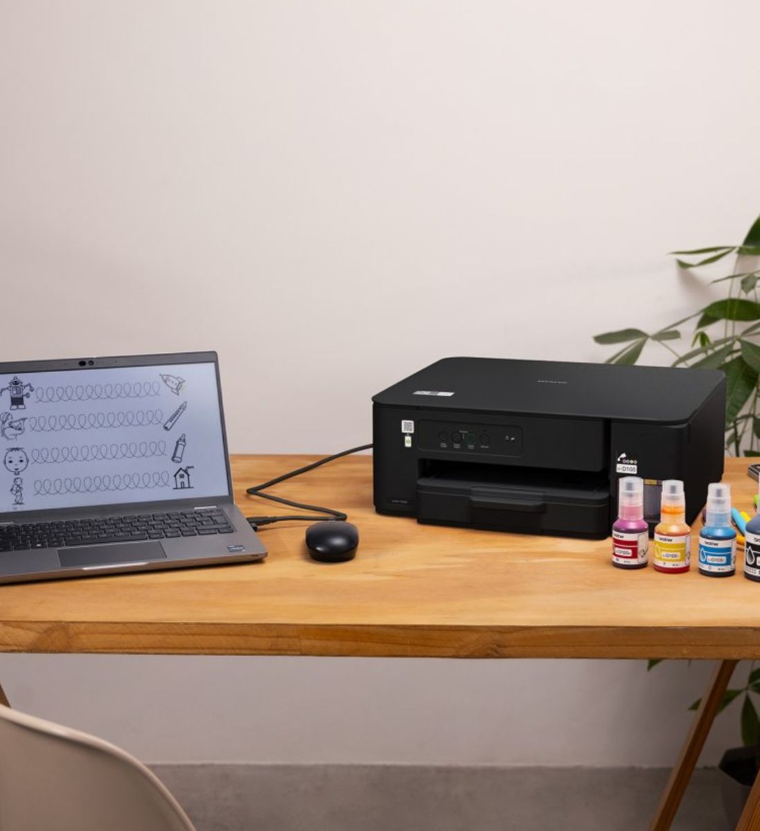 Gracias a su sistema EcoTank de recarga frontal, la Brother DCP-T230 permite imprimir grandes volúmenes a un costo muy reducido. Los tanques integrados ofrecen comodidad al momento de rellenar, evitando derrames y asegurando un uso más limpio. Además, incluye botellas de tinta originales Brother, capaces de imprimir hasta 7.500 páginas en negro y 5.000 páginas a color, garantizando un excelente costo por página.