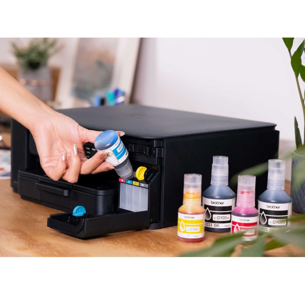 La DCP-T530DW utiliza botellas de tinta Brother BT de fácil recarga y diseño a prueba de derrames. El rendimiento aproximado es de 6.500 páginas en negro y 5.000 páginas a color, lo que la convierte en una solución confiable y económica para altos volúmenes de impresión. Además, la calidad de impresión alcanza los 1200 x 6000 dpi, garantizando textos nítidos y colores vivos en cada página.