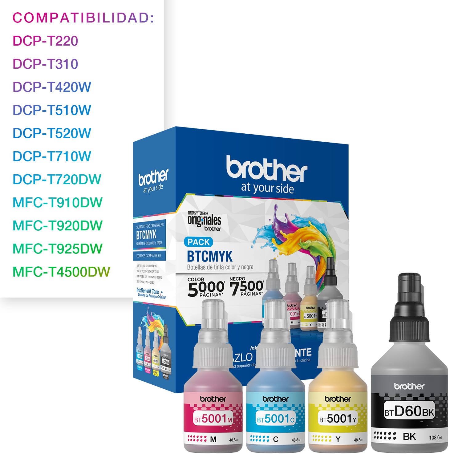 Pack original Brother con 4 botellas: BTD60BK (negro) y BT5001C/M/Y (cian, magenta y amarillo). Compatible con impresoras Brother InkBenefit Tank de nueva generación. Hasta 7.500 páginas en negro y 5.000 por color.